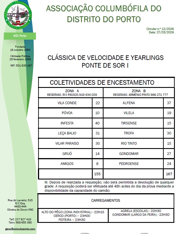 Derby ACDPorto 2024 Já está terminado o novo Pombal referente ao Derby ACDPorto Último dia de inscrições!!! Não perca esta oportunidade de participar…
